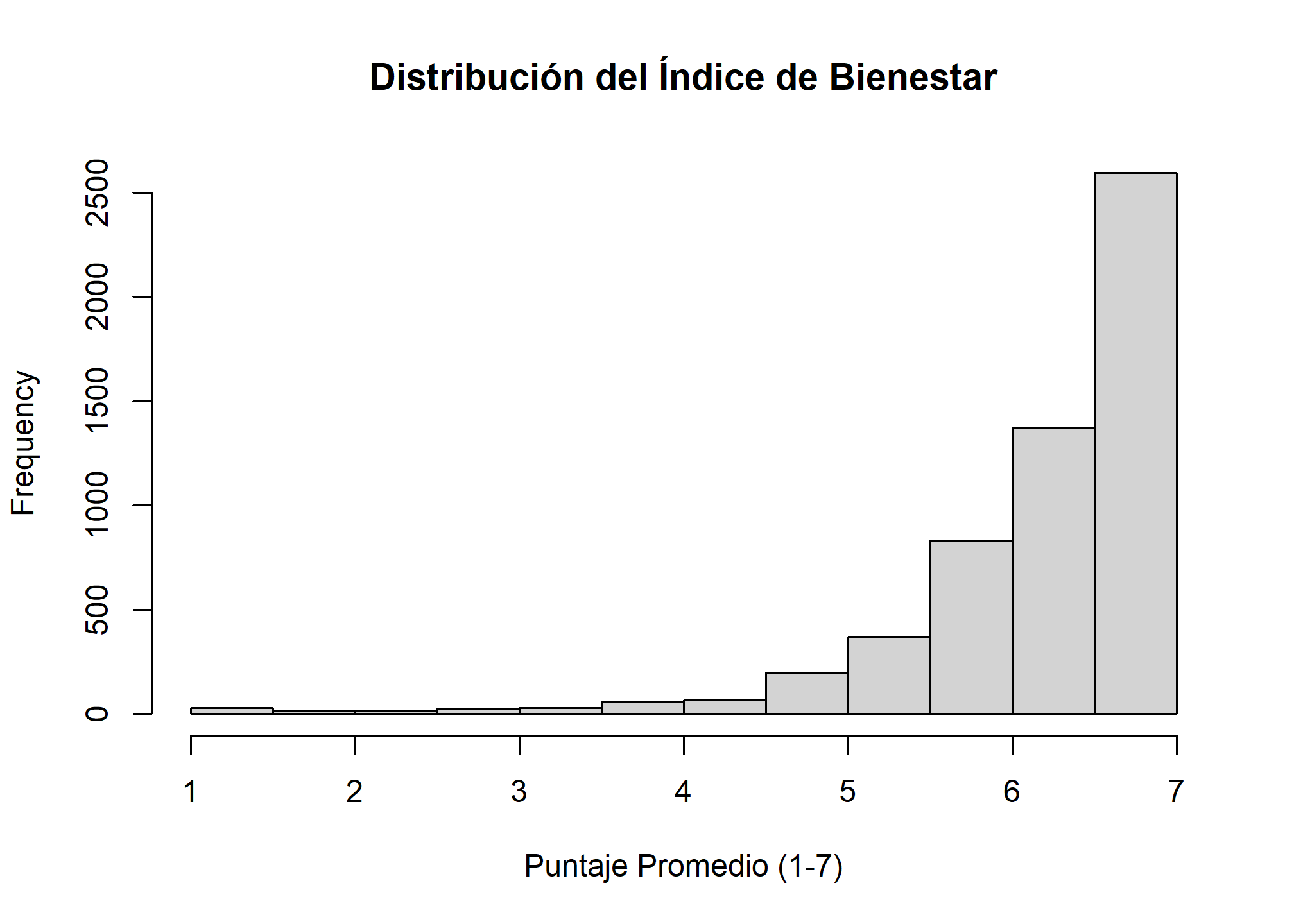 Interpretación: El summary nos muestra que el promedio del índice de bienestar es 6.28, con la mayoría de los casos concentrados en los valores altos de la escala (la mediana es 6.5). El histograma confirma esta distribución, fuertemente sesgada hacia la izquierda, lo que indica altos niveles generales de satisfacción en esta submuestra.