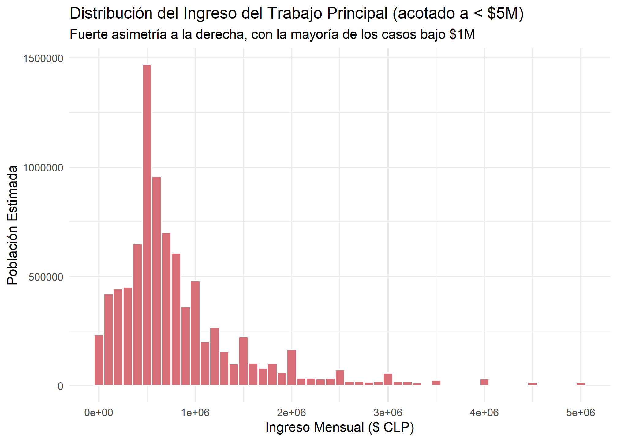 Nos centraremos en la variable ing_t_p (ingreso del trabajo principal), un ejemplo clásico de una variable cuantitativa con una distribución asimétrica.