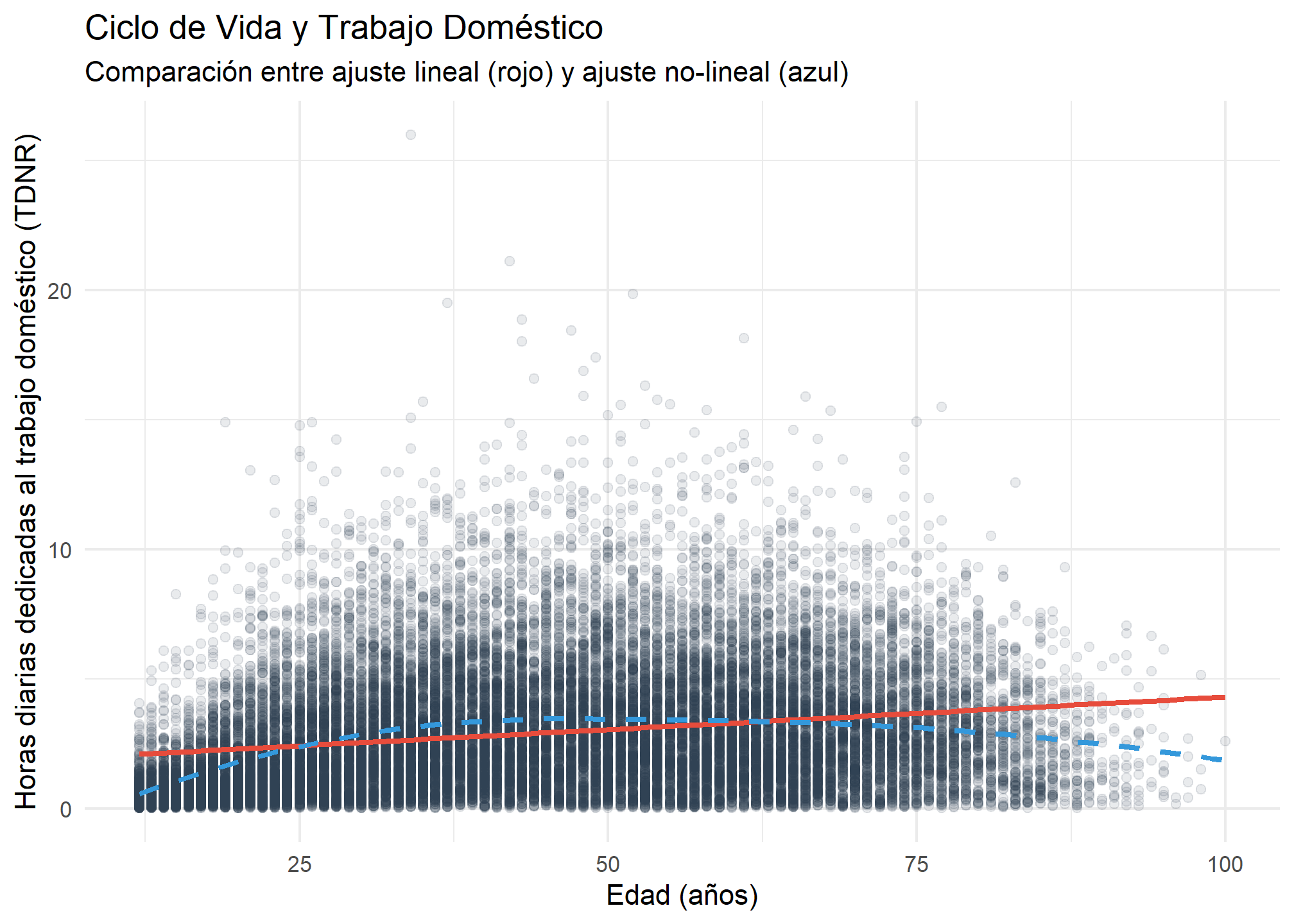 - Línea Roja (Lineal): Muestra una pendiente positiva suave. Nos dice que, en general, a mayor edad, mayor trabajo doméstico.
