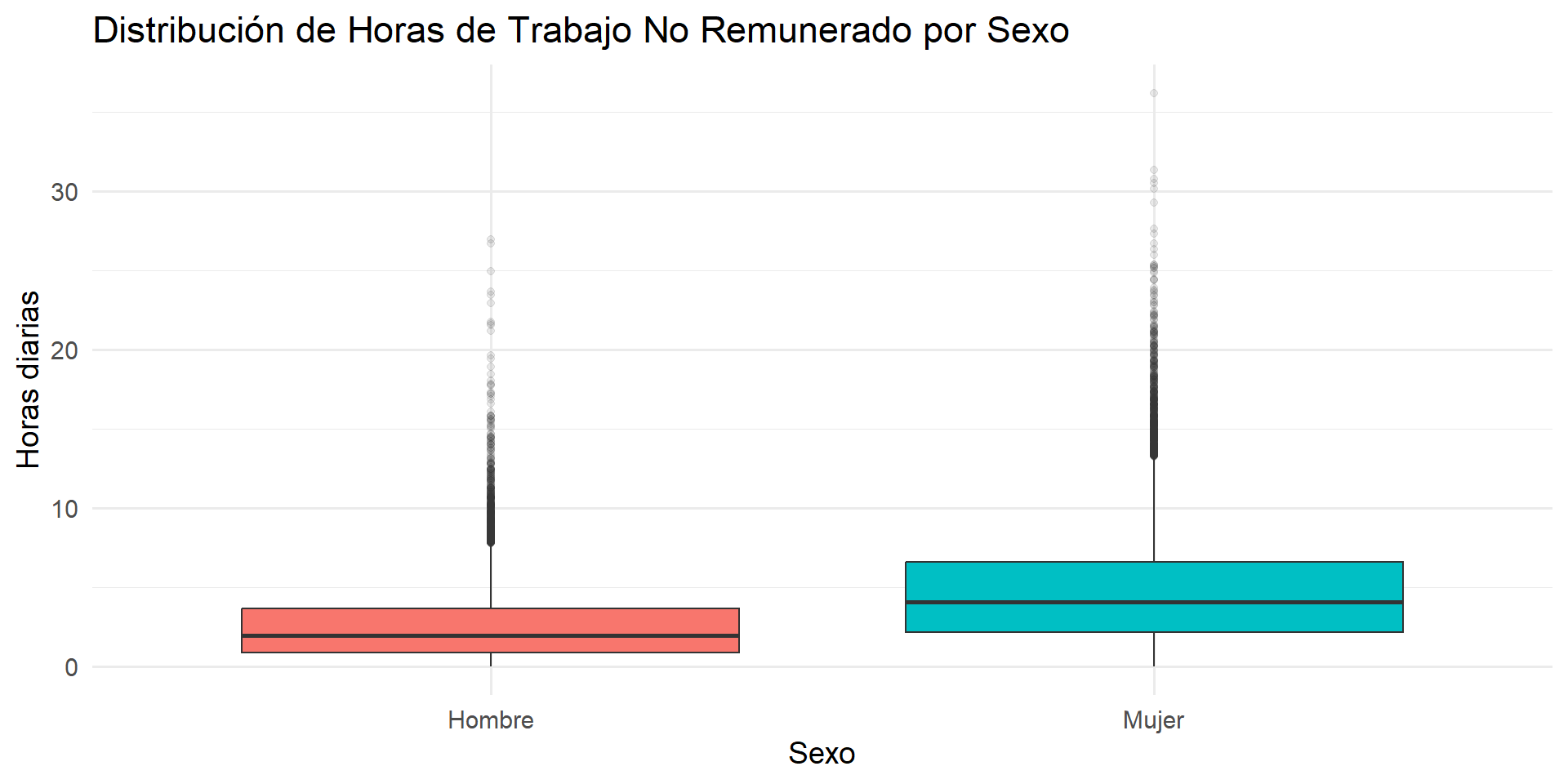 La visualización confirma la magnitud de la brecha. El boxplot de las mujeres está completamente por encima del de los hombres, indicando una diferencia estructural. La mediana de las mujeres (la línea central de su caja) es superior al tercer cuartil de los hombres (el borde superior de su caja). Esto implica que más del 50% de las mujeres dedica más tiempo al trabajo no remunerado que el 75% de los hombres.
