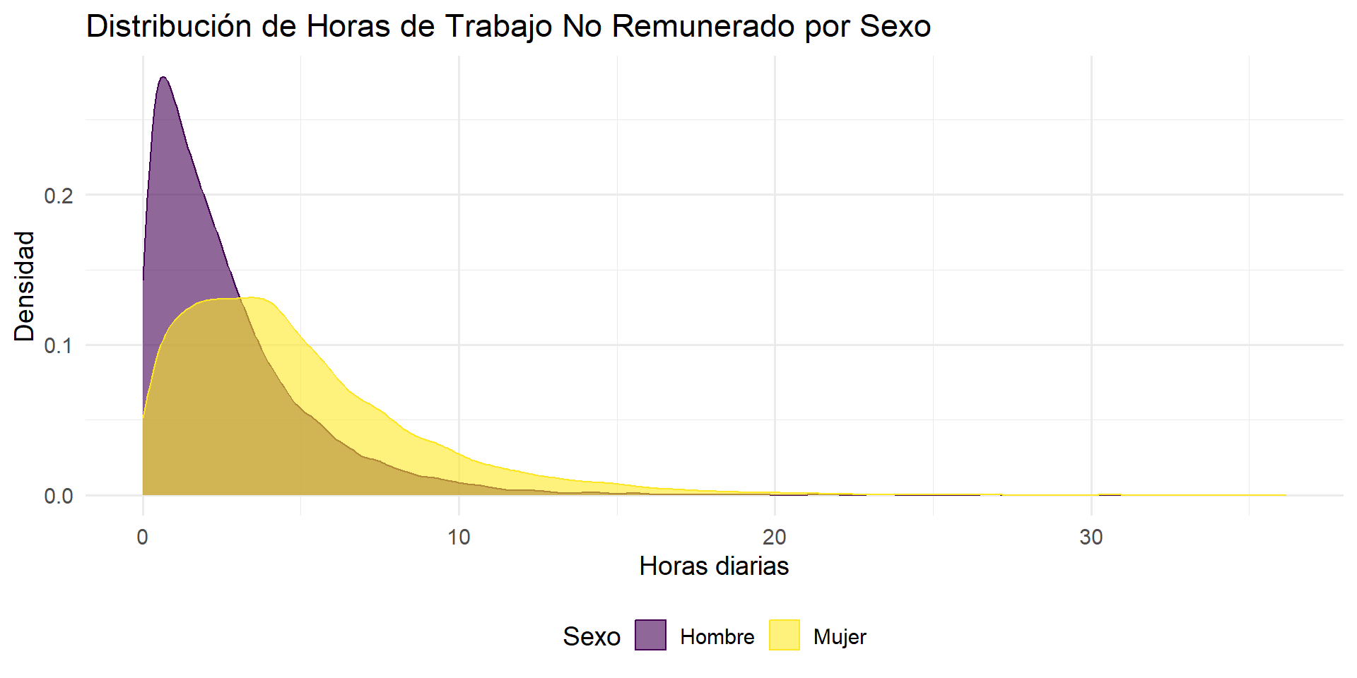 La tabla revela una marcada brecha de género. En promedio, las mujeres dedican 4.96 horas diarias al trabajo no remunerado, casi 2.1 horas más que los hombres (2.86 horas). La mediana confirma esta tendencia: el 50% de las mujeres dedica 4.11 horas o más, mientras que el 50% de los hombres dedica 2.10 horas o más. Además, la mayor desviación estándar en las mujeres (3.90) sugiere que existe más variabilidad en sus cargas de trabajo no remunerado que entre los hombres.