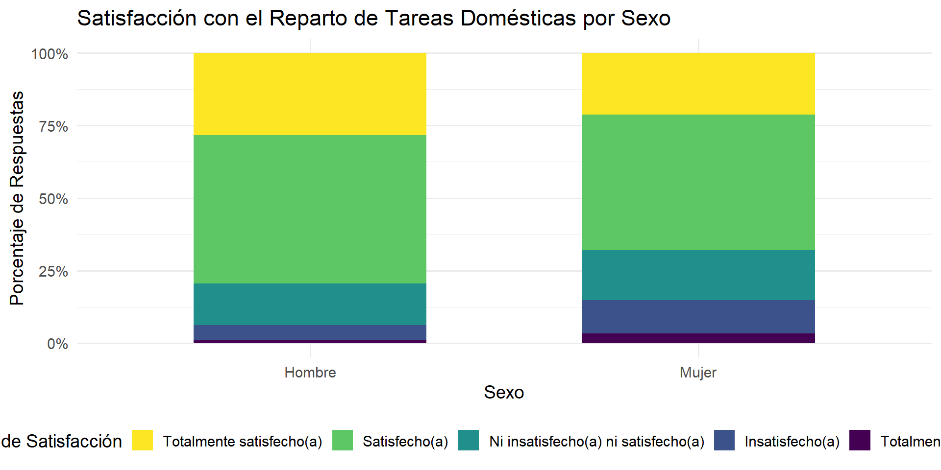 La tabla muestra que un porcentaje mayor de hombres (28.3%) que de mujeres (21.2%) siente que está “Totalmente satisfecho(a)” con el reparto de tareas. Inversamente, las mujeres reportan más insatisfacción (14.8% sumando “Insatisfecha” y “Totalmente Insatisfecha”, vs. 6.2% en hombres).