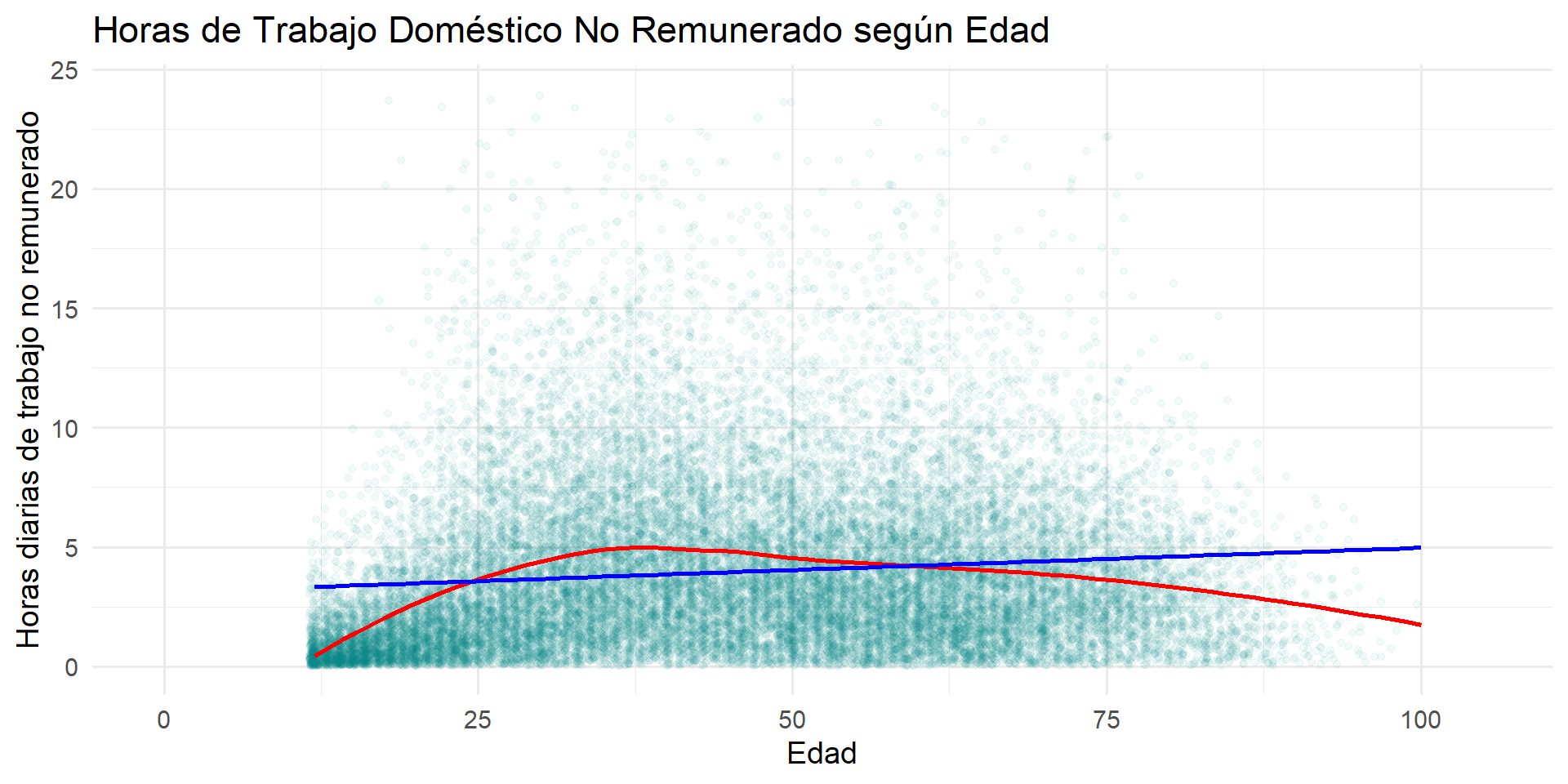 El coeficiente de correlación de Pearson es de 0.104. Al ser un valor positivo pero muy cercano a cero, indica que existe una asociación lineal muy débil entre la edad y las horas de trabajo no remunerado. Si solo miráramos este número, concluiríamos que la edad no es un factor relevante para predecir la carga de trabajo doméstico.